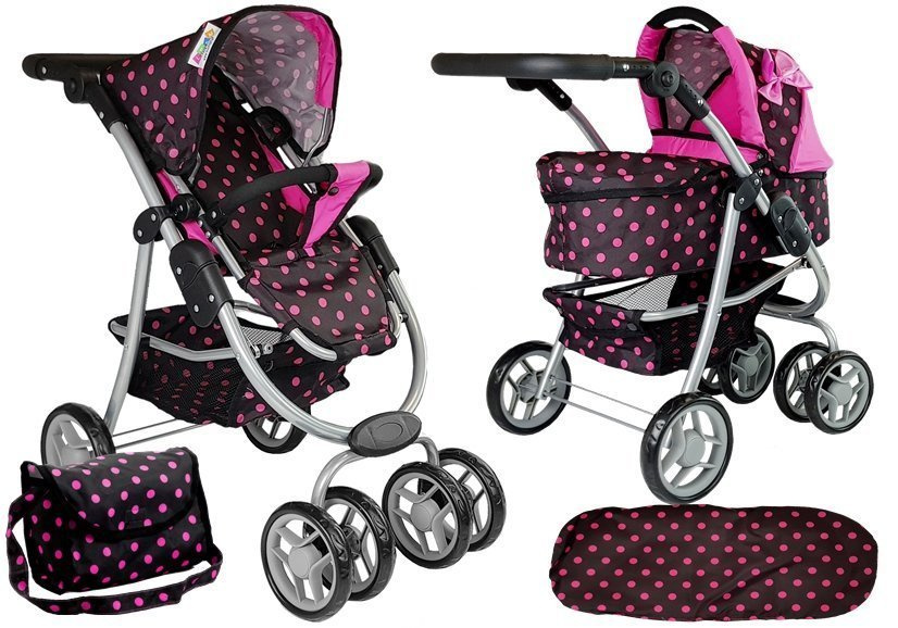 2 az 1-ben babakocsi fekete és rózsaszín pöttyös, táskával